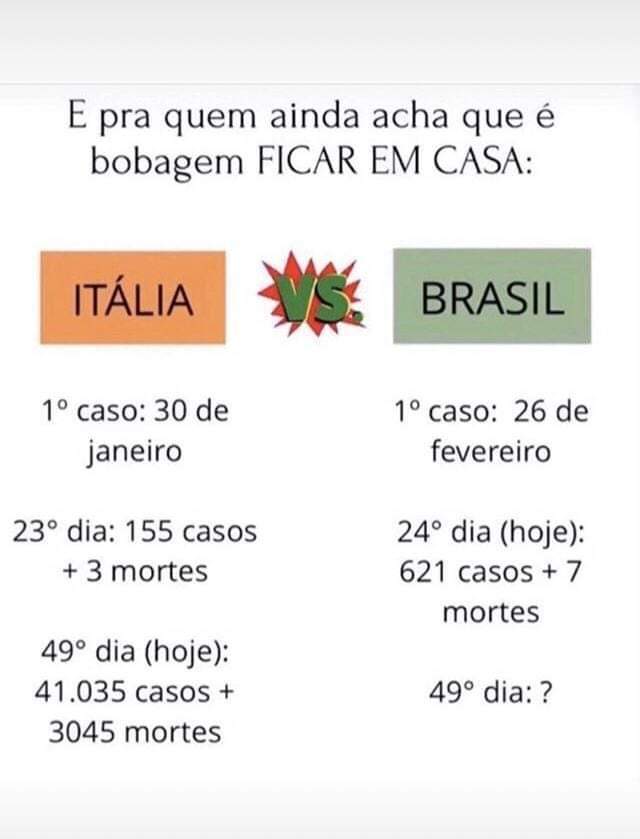 Vejamos o desafio dos italianos e façamos uma reflexão sobre a nossa realidade que já é muito mais temerosa que esta do vídeo com pacientes pelo chão dos hospitais, cobertos com jornais, com UPAs lotadas, com postos de saúde sem a mínima infraestrutura.